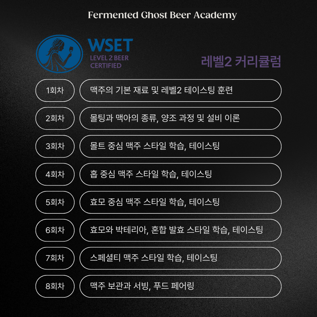 이제 전 세계의 다양한 맥주 스타일을 탐구하고, 전문가처럼 맥주를 테이스팅할 수 있는 기회를 놓치지 마세요. 퍼멘티드 고스트와 함께 WSET Level 2 맥주 자격증 과정을 통해 더 깊이 있는 맥주 교육을 경험해보세요!